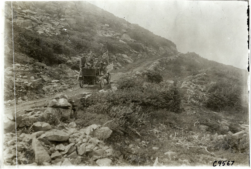 View of men riding in Packard baggage wagon during 1905 Climb to the Clouds Hill Climb at Mt. Washington, New Hampshire. Sign on side of truck reads: "Official Baggage Wagon, American Automobile Assn., Packard truck. Glidden Touring Trophy 1905." Stamped on back: "Photo by F. Ed. Spooner, 1536 B'way, telephone 6536-38th St., New York, N.Y." Handwritten on back: "Hill Climbs--Climb to the Clouds Hill Climb, 1905."