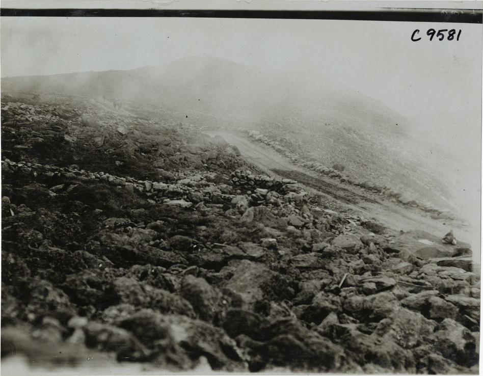 View of mountain road and rocky terrain, 1905 Climb to the Clouds Hill Climb at Mt. Washington, New Hampshire. Stamped on back: "Photo by F. Ed. Spooner, 1536 B'way, telephone 6536-38th St., New York, N.Y." Handwritten on back: "Hill Climbs--Climb to the Clouds Hill Climb, 1905."