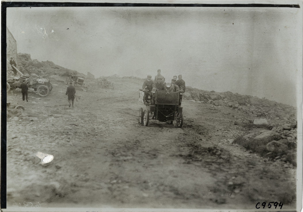 Front view of men riding in Packard baggage wagon at Climb to the Clouds Hill Climb at Mt. Washington, New Hampshire. Stamped on back: "Photo by F. Ed. Spooner, 1536 B'way, telephone 6536-38th St., New York, N.Y." Handwritten on back: "Hill Climbs--Climb to the Clouds Hill Climb, 1905."