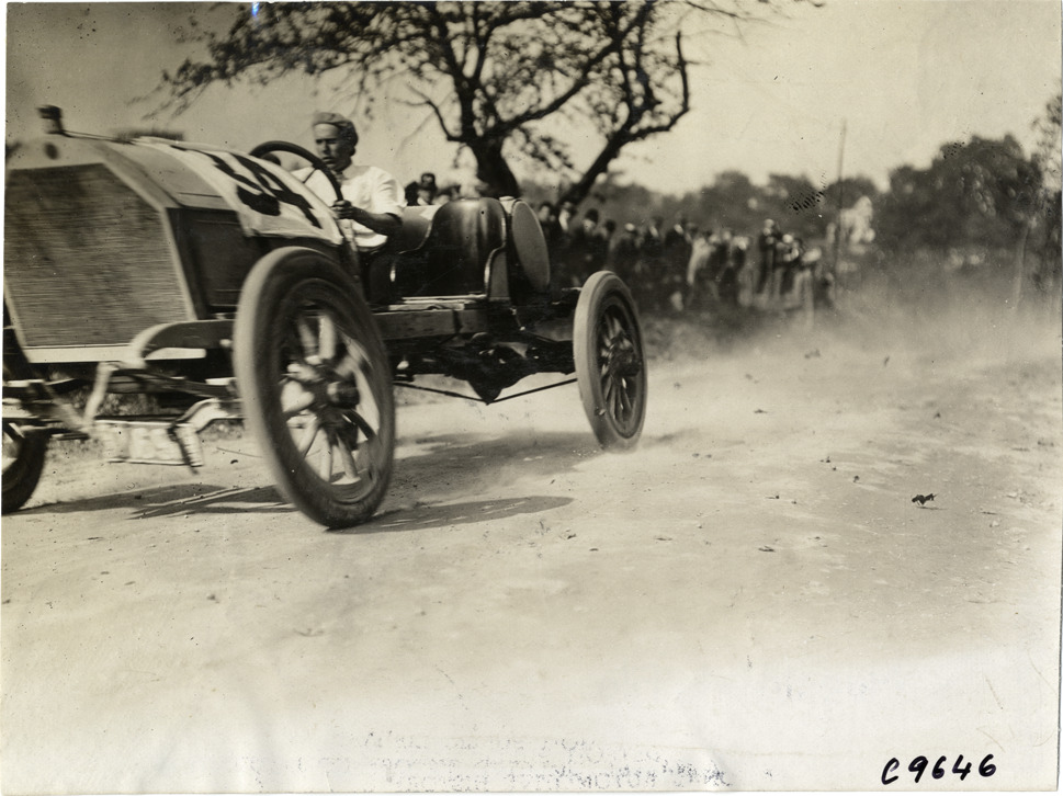 L.B. Lorimer driving Chalmers-Detroit racecar, 1909 Dead Horse Hill Climb