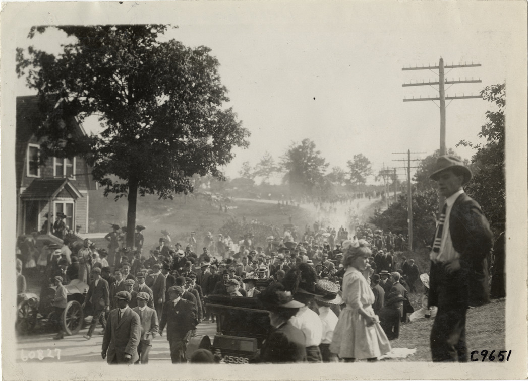 View of crowd of spectators in road at 1910 Dead Horse Hill Climb in Worcester, Massachusetts; wooden-frame house on left. Stamped on back: "Spooner & Wells, Inc., photographers, telephones 3472-3473 Columbus, 1931 Broadway, New York." Handwritten on back: "Hill Climbs--Dead Horse Hill Climb, 1910."