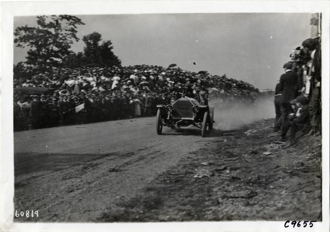 View of driver and passenger in racecar at 1910 Dead Horse Hill Climb in Worcester, Massachusetts. Spectators watch from roadside. Stamped on back: "Spooner & Wells, Inc., photographers, telephones 3472-3473 Columbus, 1931 Broadway, New York." Handwritten on back: "Hill Climbs--Dead Horse Hill Climb, 1910."