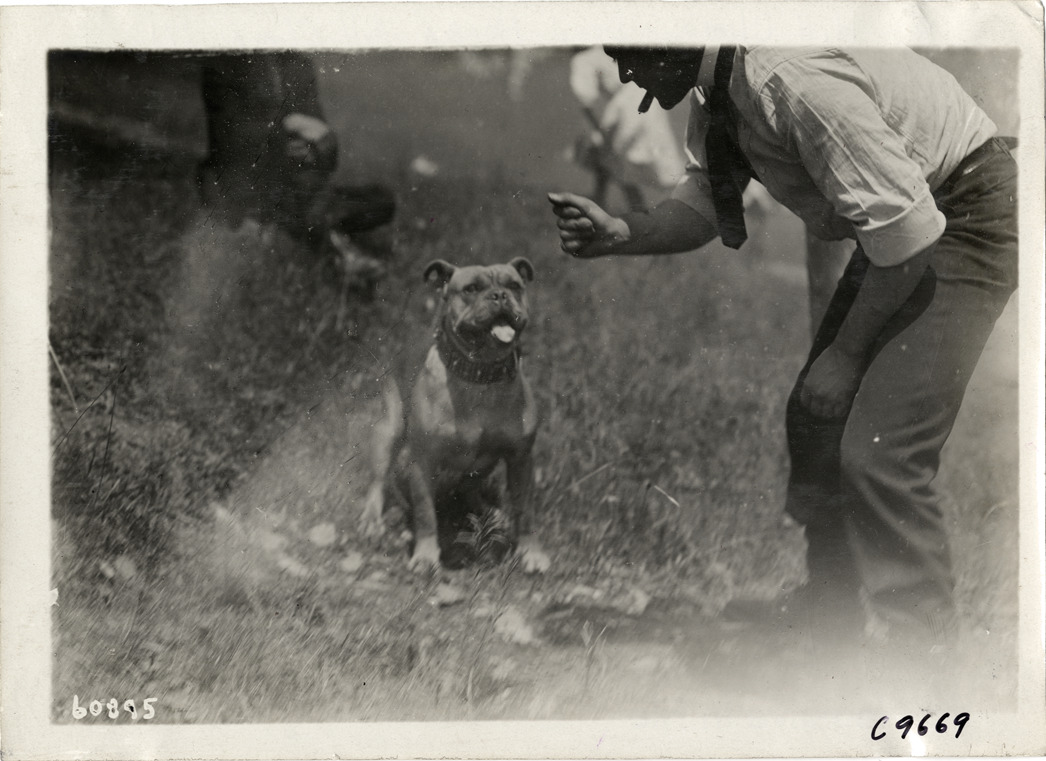 View of man with dog at 1910 Dead Horse Hill Climb in Worcester, Massachusetts. Stamped on back: "Spooner & Wells, Inc., photographers, telephones 3472-3473 Columbus, 1931 Broadway, New York." Handwritten on back: "Hill Climbs--Dead Horse Hill Climb, 1910."