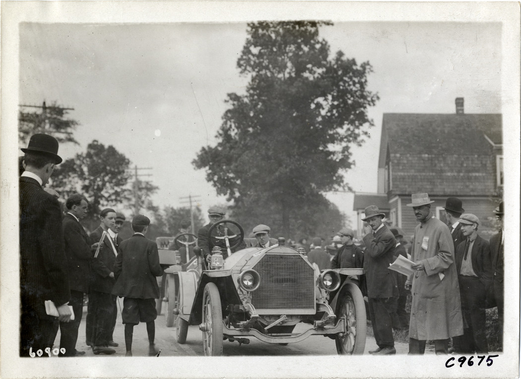 View of driver in racecar at 1910 Dead Horse Hill Climb in Worcester, Massachusetts. Spectators stand nearby on both sides of road; house in background. Stamped on back: "Spooner & Wells, Inc., photographers, telephones 3472-3473 Columbus, 1931 Broadway, New York." Handwritten on back: "Hill Climbs--Dead Horse Hill Climb, 1910."