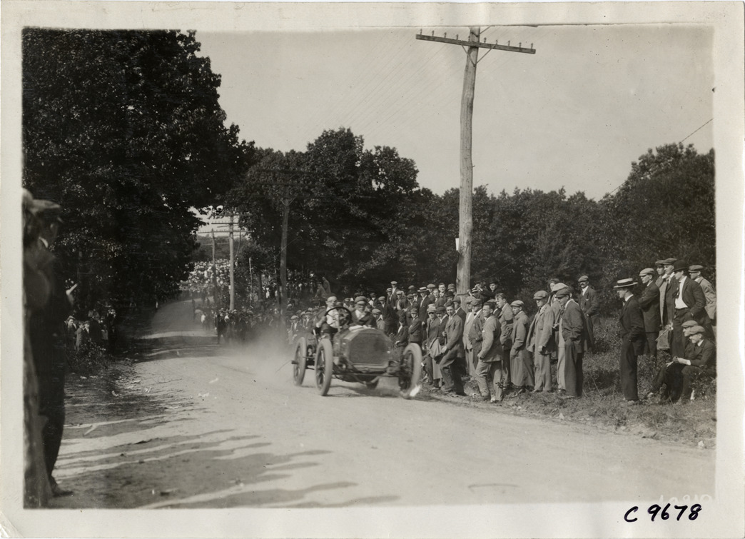 View of driver and passenger in racecar at 1910 Dead Horse Hill Climb in Worcester, Massachusetts. Spectators watch from roadside. Stamped on back: "Spooner & Wells, Inc., photographers, telephones 3472-3473 Columbus, 1931 Broadway, New York." Handwritten on back: "Hill Climbs--Dead Horse Hill Climb, 1910."