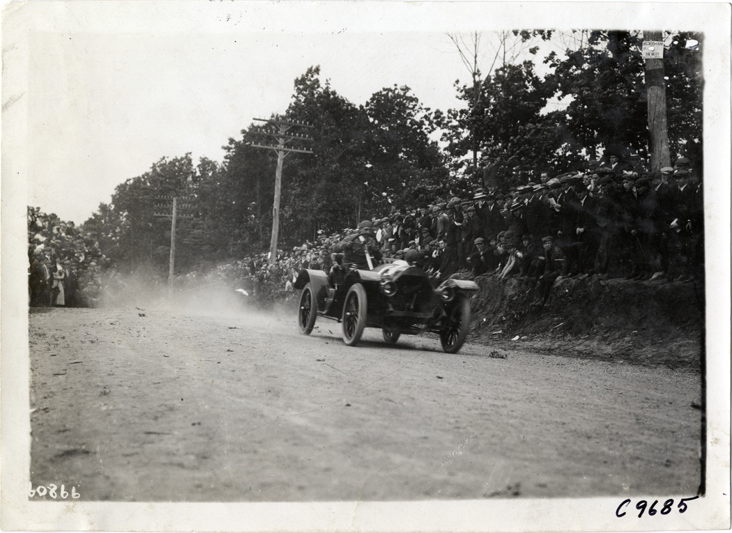 View of driver in racecar at 1910 Dead Horse Hill Climb in Worcester, Massachusetts. Spectators watch from roadside. Stamped on back: "Spooner & Wells, Inc., photographers, telephones 3472-3473 Columbus, 1931 Broadway, New York." Handwritten on back: "Hill Climbs--Dead Horse Hill Climb, 1910."
