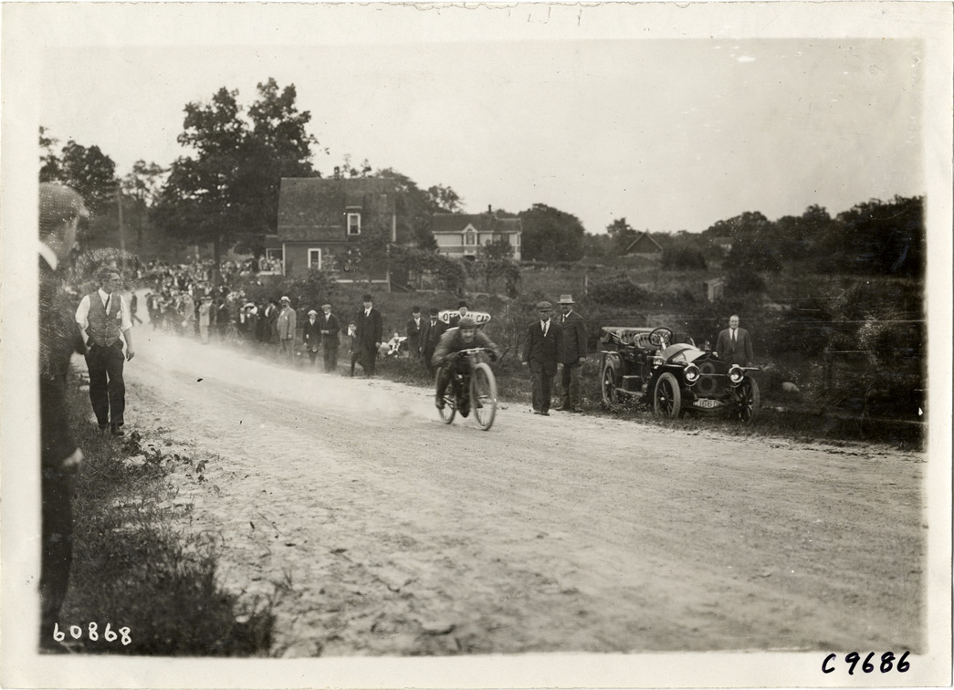 View of motorcyclist at 1910 Dead Horse Hill Climb in Worcester, Massachusetts. Spectators watch from roadside; car parked on side of road. Houses in background. Stamped on back: "Spooner & Wells, Inc., photographers, telephones 3472-3473 Columbus, 1931 Broadway, New York." Handwritten on back: "Hill Climbs--Dead Horse Hill Climb, 1910."