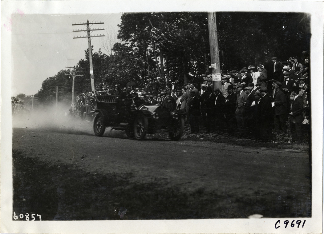 View of driver in Chalmers-Detroit racecar at 1910 Dead Horse Hill Climb in Worcester, Massachusetts. Spectators watch from roadside. Stamped on back: "Spooner & Wells, Inc., photographers, telephones 3472-3473 Columbus, 1931 Broadway, New York." Handwritten on back: "Hill Climbs--Dead Horse Hill Climb, 1910. Chalmers-Detroit."
