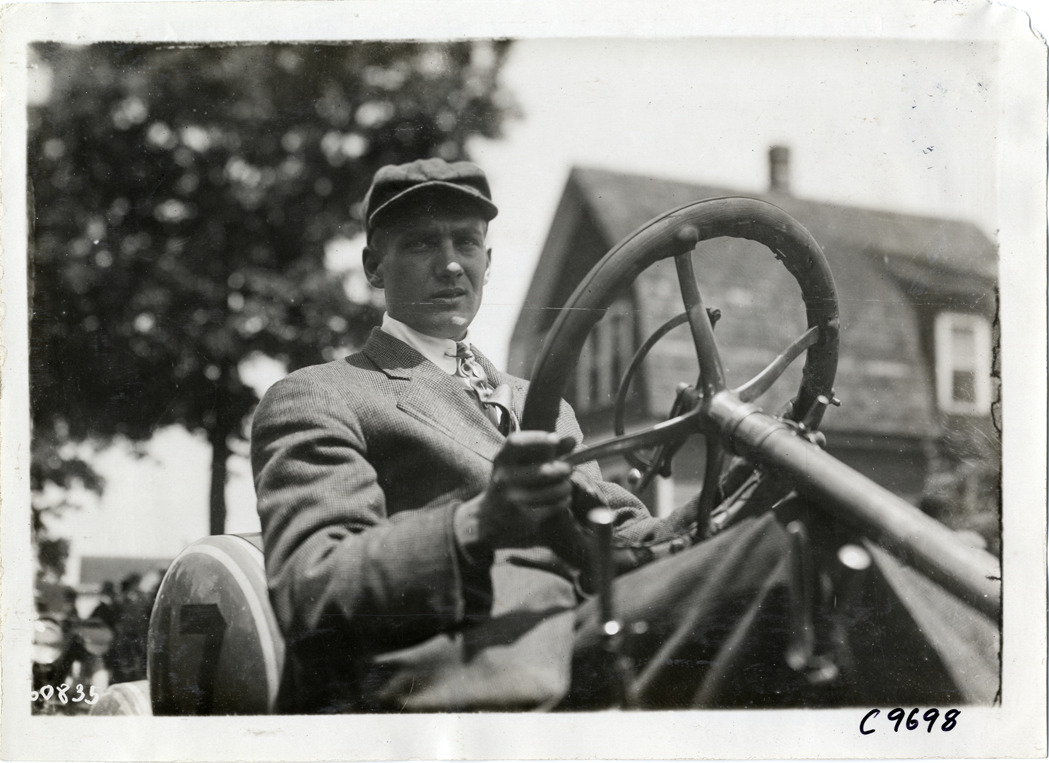 Portrait of driver in racecar at 1910 Dead Horse Hill Climb in Worcester, Massachusetts. Stamped on back: "Spooner & Wells, Inc., photographers, telephones 3472-3473 Columbus, 1931 Broadway, New York." Handwritten on back: "Hill Climbs--Dead Horse Hill Climb, 1910."