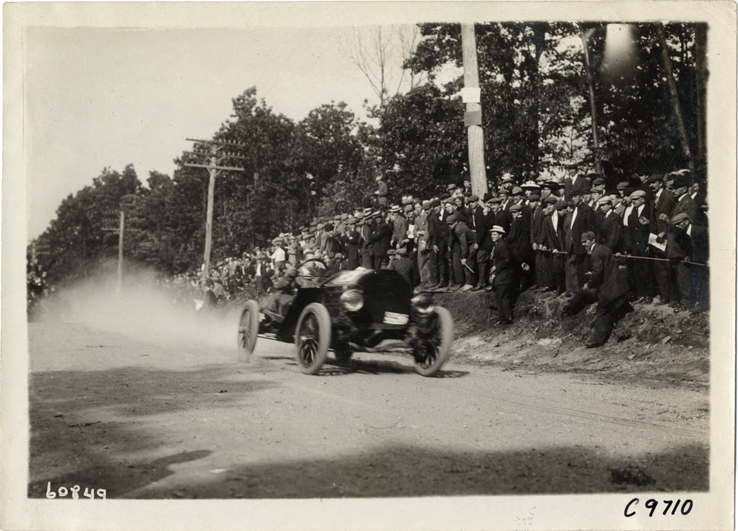 View of driver in racecar at 1910 Dead Horse Hill Climb in Worcester, Massachusetts. Spectators watch from roadside. Stamped on back: "Spooner & Wells, Inc., photographers, telephones 3472-3473 Columbus, 1931 Broadway, New York." Handwritten on back: "Hill Climbs--Dead Horse Hill Climb, 1910."
