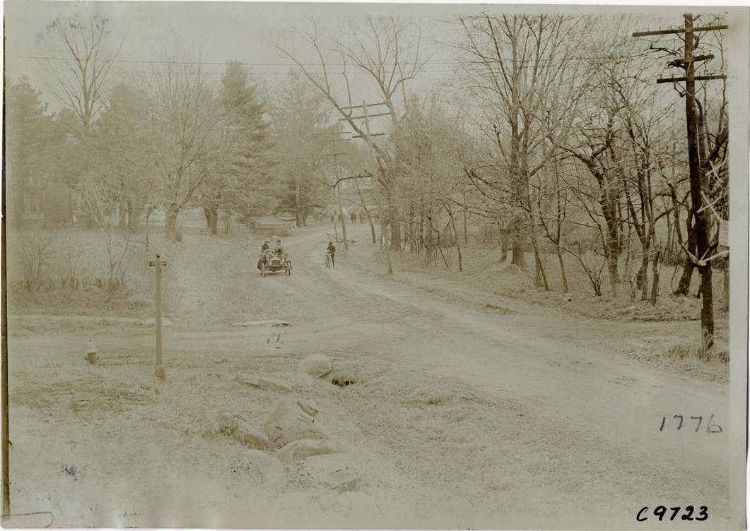 Distant view of motorists in car on rural dirt road during 1904 Eagle Rock Hill Climb in West Orange, New Jersey. Car stops next to bicyclist. Handwritten on back: "Hill Climbs--Eagle Rock Hill Climb, 1904."
