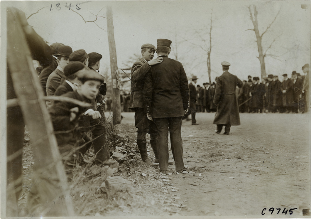 View of C.H. Gillette speaking with police officer during 1904 Eagle Rock Hill Climb in West Orange, New Jersey. Handwritten on back: "Hill Climbs--Eagle Rock Hill Climb, 1904."