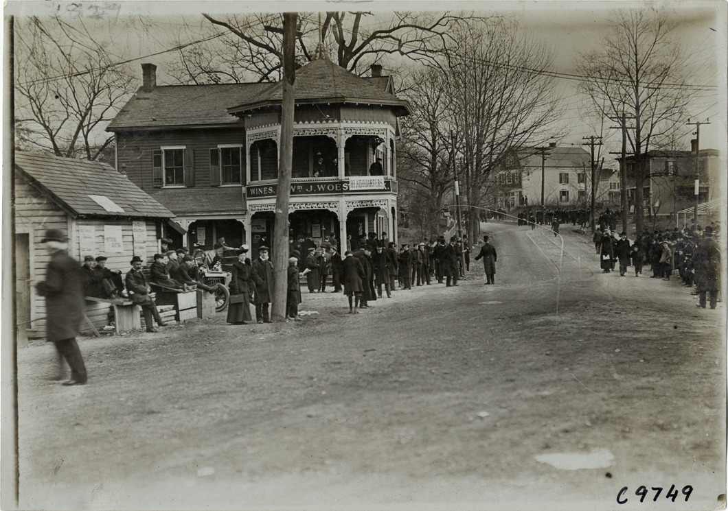 View of spectators in town during 1904 Eagle Rock Hill Climb in West Orange, New Jersey. "Headquarters" banner on wooden-frame building in background. Handwritten on back: "Hill Climbs--Eagle Rock Hill Climb, 1904."