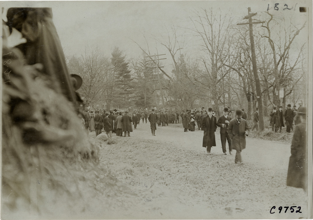 View of spectators at 1904 Eagle Rock Hill Climb in West Orange, New Jersey. Handwritten on back: "Hill Climbs--Eagle Rock Hill Climb, 1904."