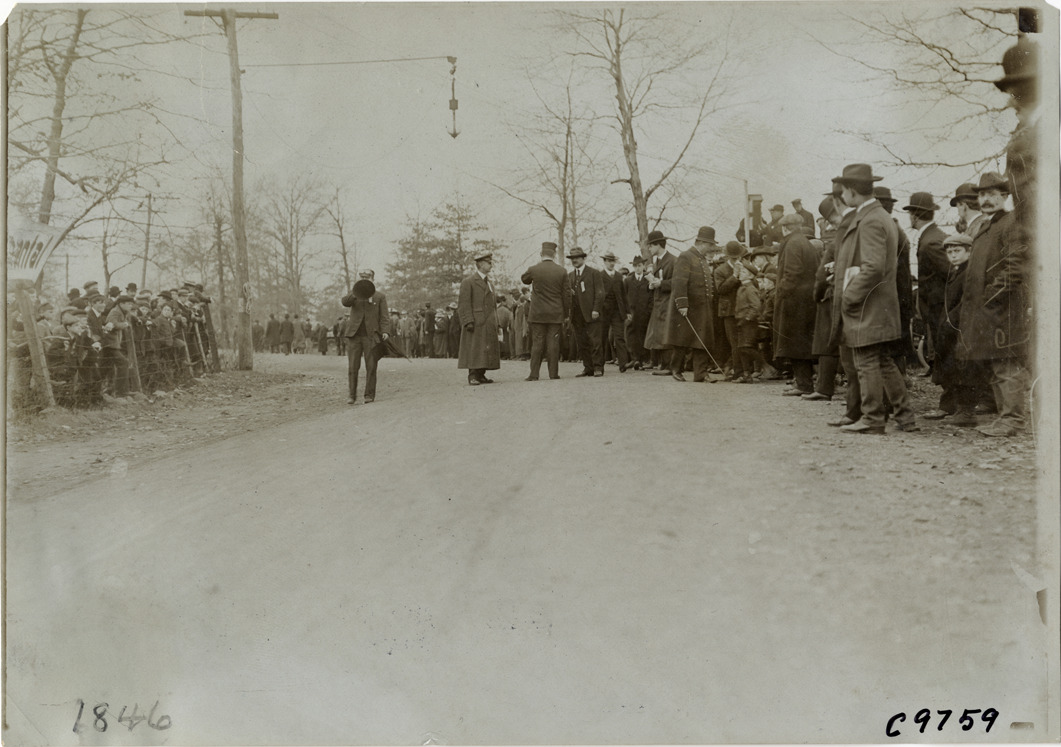 Favorite this☆ Spectators at 1904 Eagle Rock Hill Climb Description: View of spectators at 1904 Eagle Rock Hill Climb in West Orange, New Jersey. Policemen and man holding megaphone stand in road. Handwritten on back: "Hill Climbs--Eagle Rock Hill Climb, 1904." Details Resource ID: na007966 Subject: Automobile racing fans--New Jersey--West Orange Hillclimbing (Automobile racing)--New Jersey--West Orange Photographic prints Date Issued: 1904-11 Format: 1 photographic print ; 5 x 7 in. Member of: National Automotive History Collection Lazarnick Collection Filing Location: Hill Climbs--Eagle Rock Hill Climb, 1904 #2 Negative Number: Negative #C9759 Rights: Physical rights are retained by DPL. Copyright is retained in accordance with U.S. copyright laws.