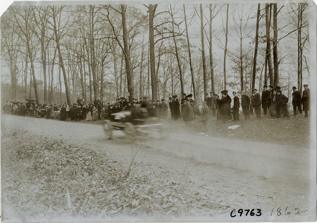 View of driver in racecar during 1904 Eagle Rock Hill Climb in West Orange, New Jersey. Spectators watch from roadside. Handwritten on back: "Hill Climbs--Eagle Rock Hill Climb, 1904."