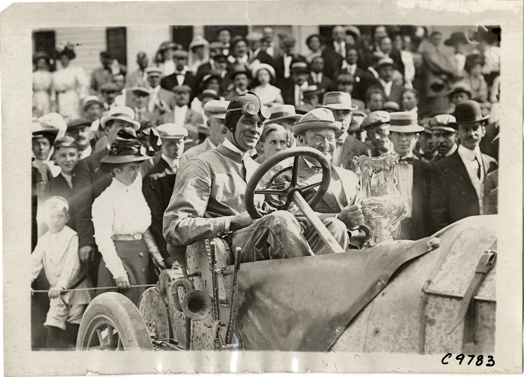 Driver and passenger with trophy cup in racecar, 1909 Earlington Hill Climb