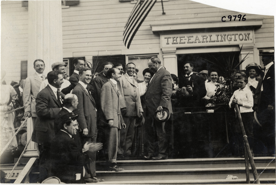 View of group of men standing next to cloth-draped table on steps of The Earlington hotel at 1909 Earlington Hill Climb in Richfield Springs, New York. Man in foreground applauds. "The Earlington" sign over doorway in background. Stamped on back: "Photo by Spooner & Wells, Inc. 1931 Broadway, N.Y." Handwritten on back: "Hill Climbs--Earlington Hill Climb, 1909."