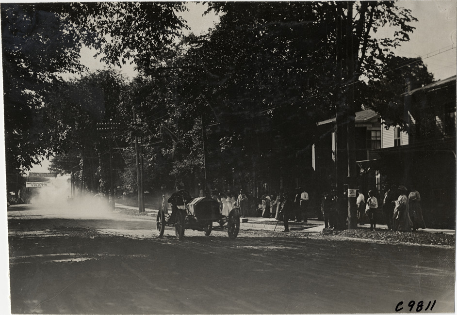 View of driver in racecar at 1909 Earlington Hill Climb in Richfield Springs, New York. Spectators watch from roadside. Stamped on back: "Photo by Spooner & Wells, Inc. 1931 Broadway, N.Y." Handwritten on back: "Hill Climbs--Earlington Hill Climb, 1909."