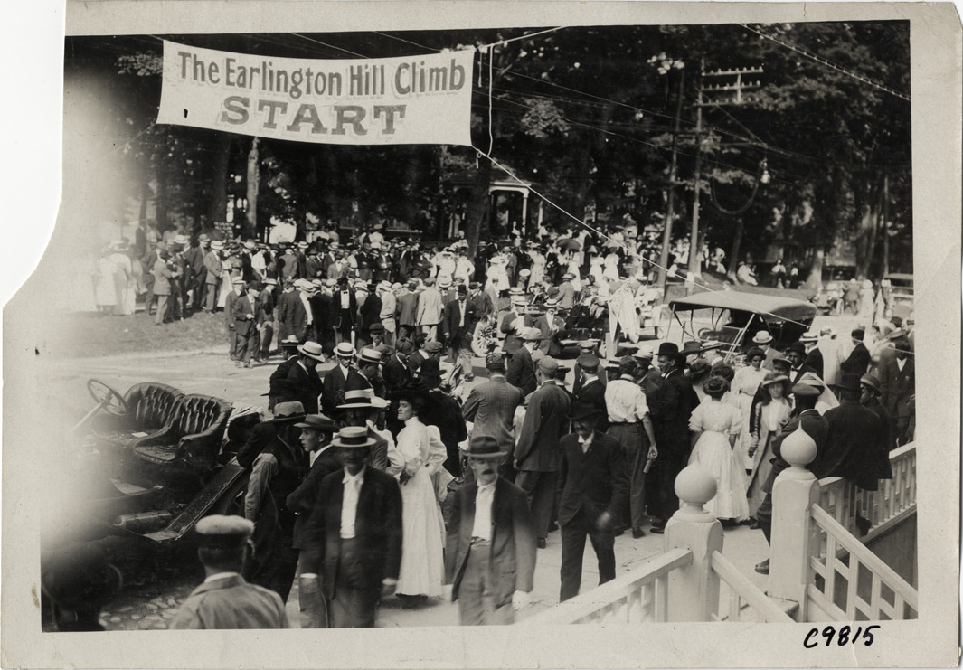 View of crowd of spectators at starting line at 1909 Earlington Hill Climb in Richfield Springs, New York. Banner over street reads: "The Earlington Hill Climb, Start." Stamped on back: "Photo by Spooner & Wells, Inc. 1931 Broadway, N.Y." Handwritten on back: "Hill Climbs--Earlington Hill Climb, 1909."