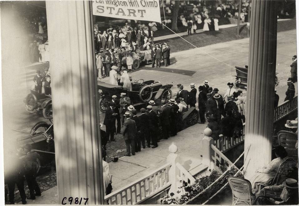 Spectators and automobiles at starting line, 1909 Earlington Hill Climb