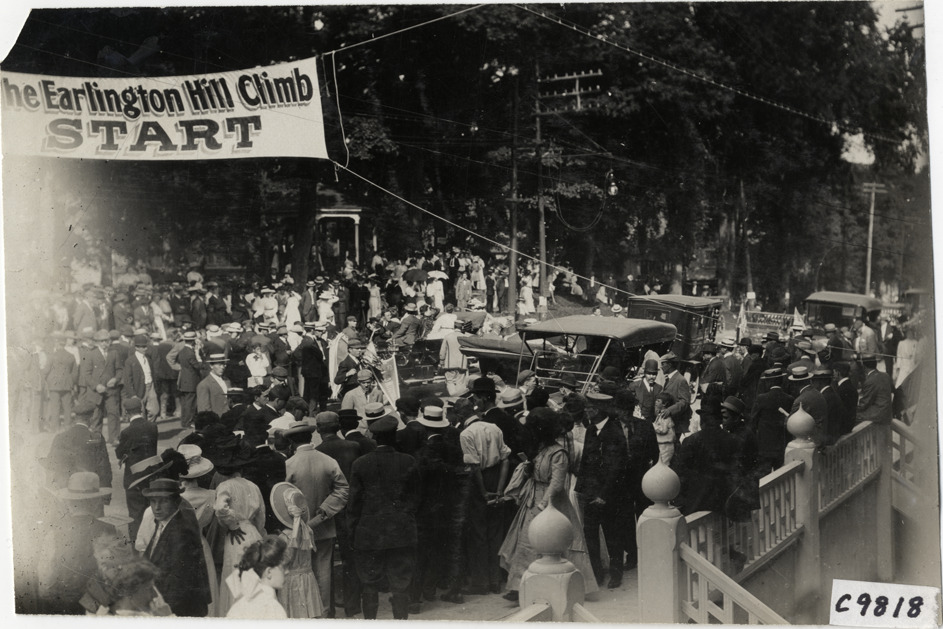 Crowd at starting line, 1909 Earlington Hill Climb