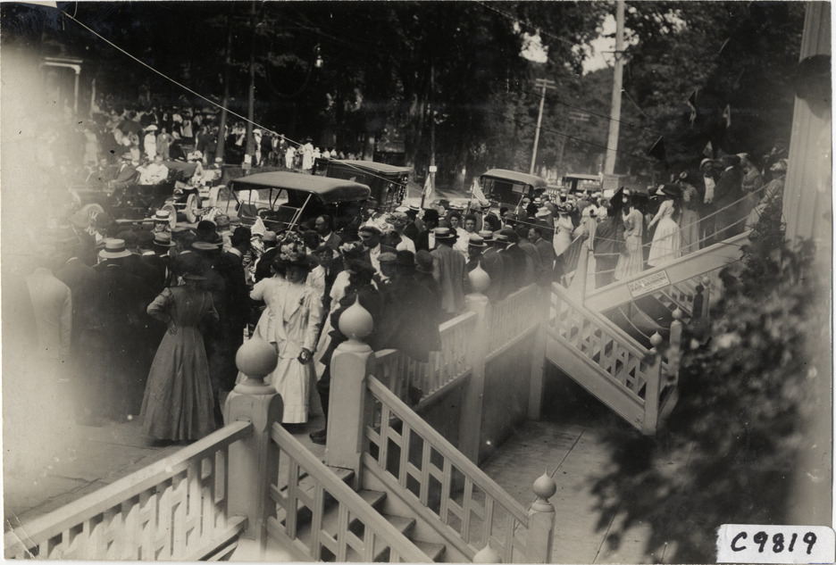 View of crowd of spectators and cars at starting line at 1909 Earlington Hill Climb in Richfield Springs, New York. Stamped on back: "Photo by Spooner & Wells, Inc. 1931 Broadway, N.Y." Handwritten on back: "Hill Climbs--Earlington Hill Climb, 1909."