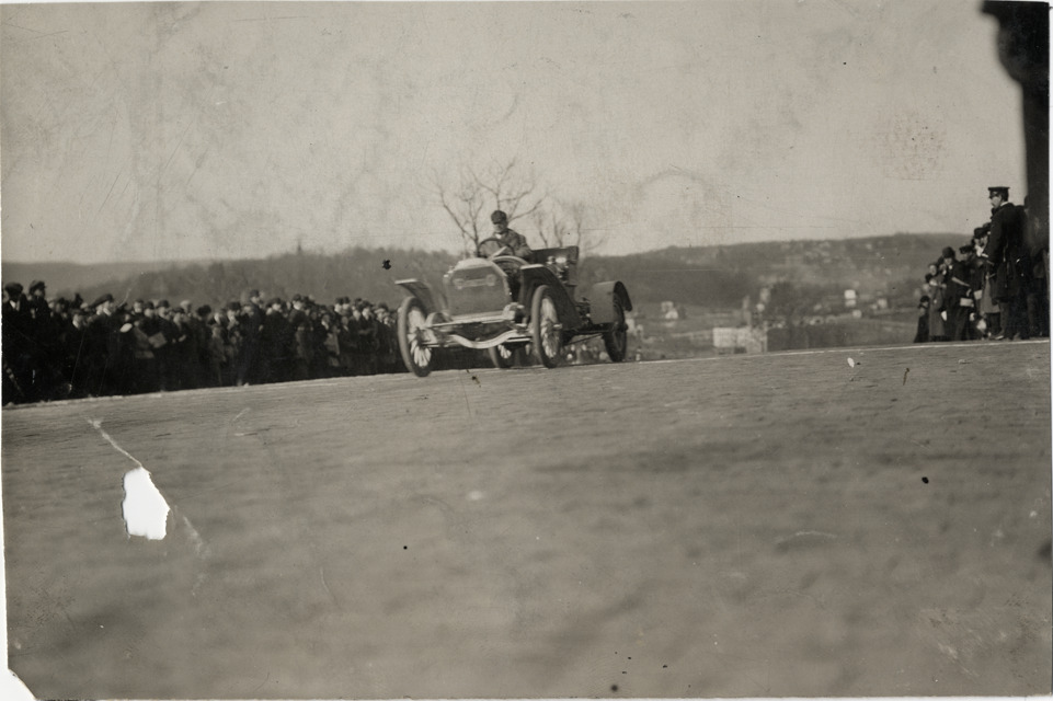 View of driver in racecar at 1908 Fort George Hill Climb in New York, New York. Spectators watch from roadside. Stamped on back: "Spooner and Wells, 1931 Broadway, New York, duplicates any time, enlargements all sizes, tel. 3472-3473 Col., credit appreciated." Handwritten on back: "Hill Climbs--Fort George, 1908."