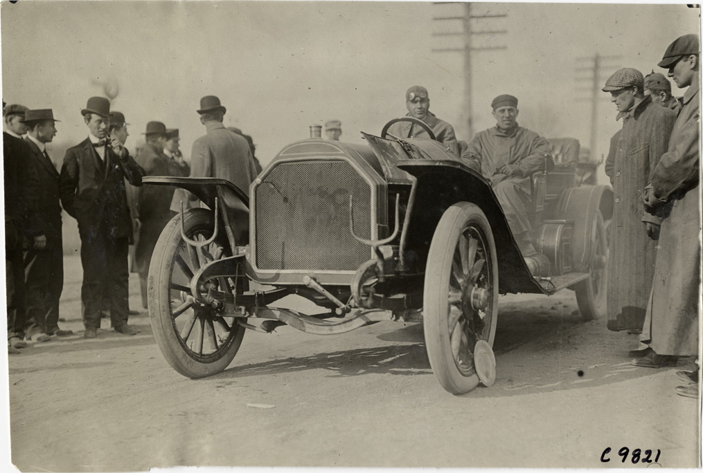 View of driver and passenger in racecar at 1909 Fort George Hill Climb in New York, New York. Stamped on back: "Spooner & Wells, Inc., photographers, telephones 3472-3473 Columbus, 1931 Broadway, New York." Handwritten on back: "Hill Climbs--Fort George, 1909."