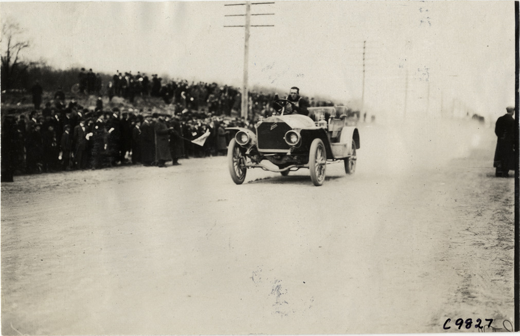 View of Bourque driving Knox racecar at 1909 Fort George Hill Climb in New York, New York. Spectators watch from roadside. Stamped on back: "Spooner & Wells, Inc., photographers, telephones 3472-3473 Columbus, 1931 Broadway, New York." Handwritten on back: "Hill Climbs--Fort George, 1909. Knox, Bourque."