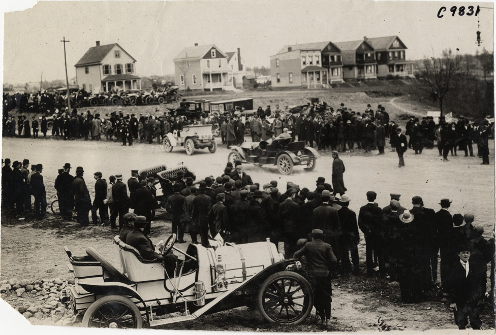 View of spectators watching racecars at 1909 Fort George Hill Climb in New York, New York. Car in foreground; houses in background. Stamped on back: "Spooner & Wells, Inc., photographers, telephones 3472-3473 Columbus, 1931 Broadway, New York." Handwritten on back: "Hill Climbs--Fort George, 1909."