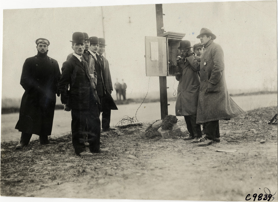 Men at telephone box, 1909 Fort George Hill Climb