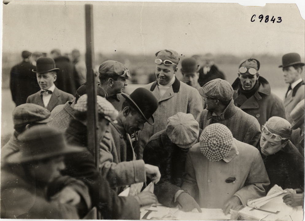 View of group of men examining paperwork at 1909 Fort George Hill Climb in New York, New York. Stamped on back: "Spooner & Wells, Inc., photographers, telephones 3472-3473 Columbus, 1931 Broadway, New York." Handwritten on back: "Hill Climbs--Fort George, 1909."