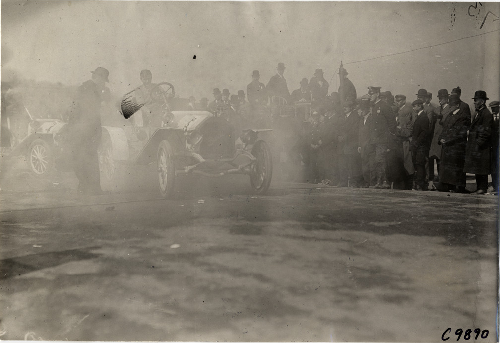 View of man speaking with driver in Buick racecar at 1909 Fort George Hill Climb in New York, New York. Spectators watch from roadside. Stamped on back: "Spooner & Wells, Inc., photographers, telephones 3472-3473 Columbus, 1931 Broadway, New York." Handwritten on back: "Hill Climbs--Fort George, 1909. Buick."