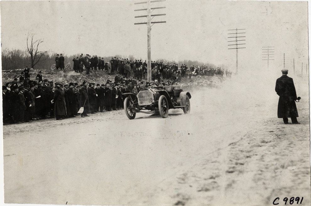 View of Rutherford driving Stearns racecar at 1909 Fort George Hill Climb in New York, New York. Spectators watch from roadside. Stamped on back: "Spooner & Wells, Inc., photographers, telephones 3472-3473 Columbus, 1931 Broadway, New York." Handwritten on back: "Hill Climbs--Fort George, 1909. Stearns, Rutherford."