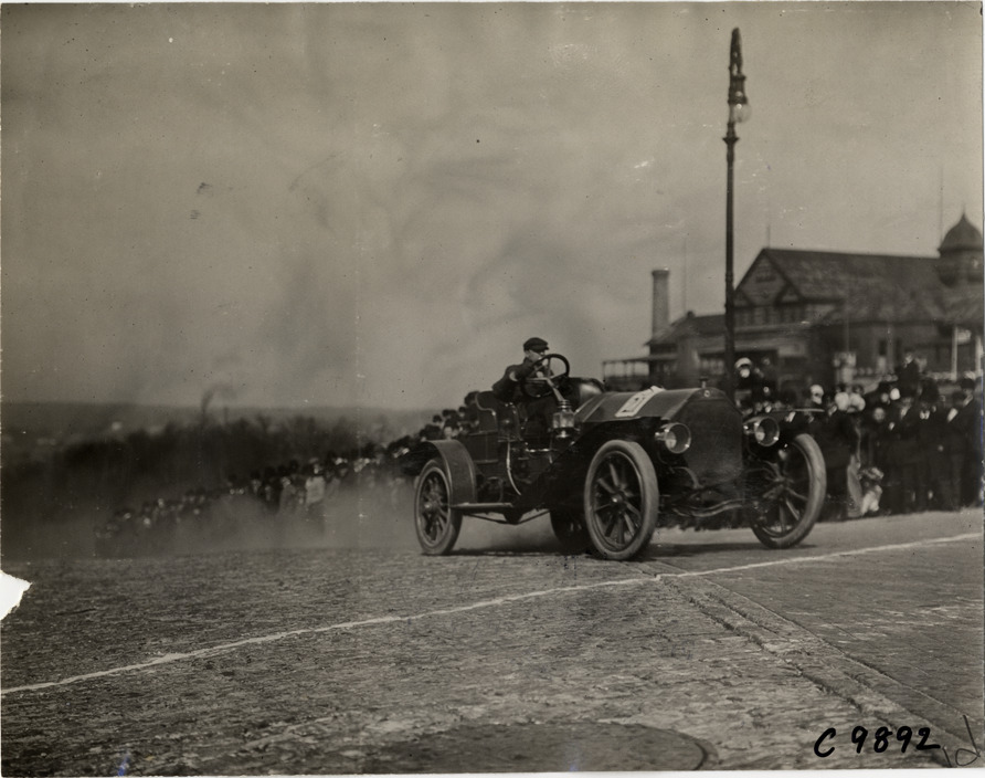 View of Lescault driving Palmer & Singer racecar at 1909 Fort George Hill Climb in New York, New York. Spectators watch from roadside; buildings in background. Stamped on back: "Spooner & Wells, Inc., photographers, telephones 3472-3473 Columbus, 1931 Broadway, New York." Handwritten on back: "Hill Climbs--Fort George, 1909. P & S, Lescault."