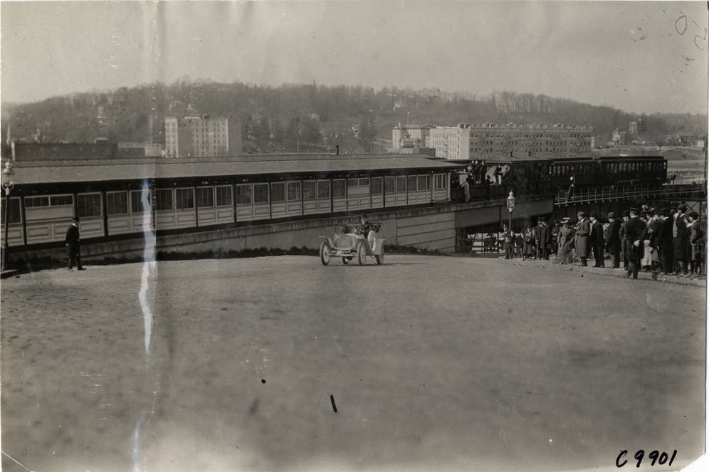 View of H.E. Wagner driving Babcock racecar at 1909 Fort George Hill Climb in New York, New York. Spectators watch from roadside; elevated train in background. Stamped on back: "Spooner & Wells, Inc., photographers, telephones 3472-3473 Columbus, 1931 Broadway, New York." Handwritten on back: "Hill Climbs--Fort George, 1909. Babcock Elec., H.E. Wagner."