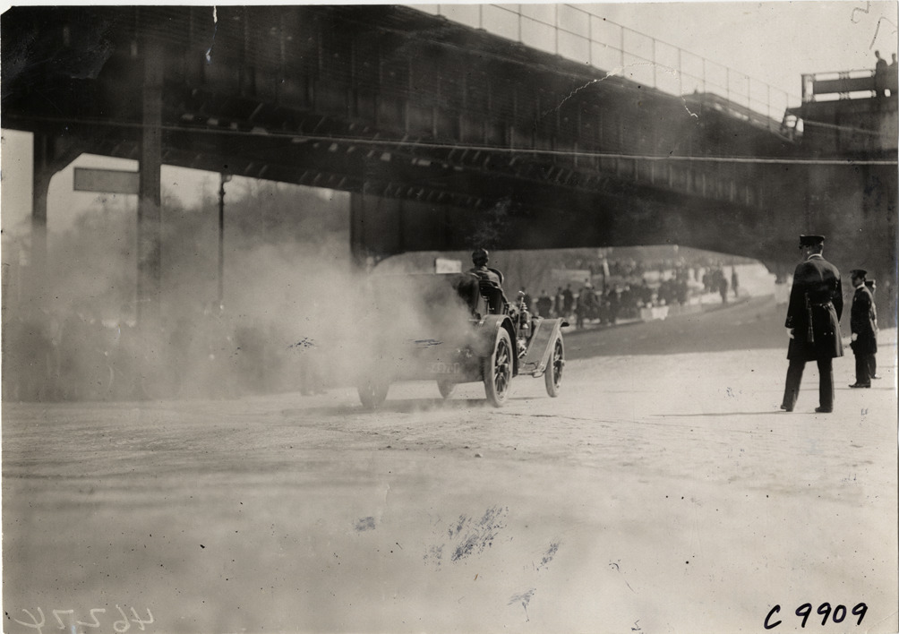 Rear view of driver in Acme racecar driving under bridge at 1909 Fort George Hill Climb in New York, New York. Spectators watch from roadside. Stamped on back: "Spooner & Wells, Inc., photographers, telephones 3472-3473 Columbus, 1931 Broadway, New York." Handwritten on back: "Hill Climbs--Fort George, 1909. Acme."