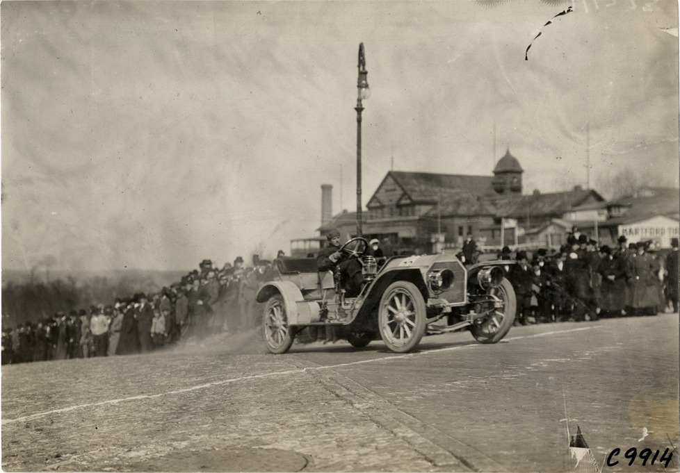 Swan driving Stearns racecar, 1909 Fort George Hill Climb
