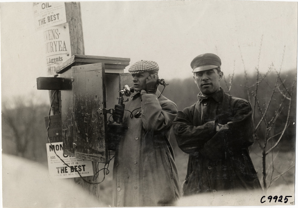 View of two men standing at telephone box at 1909 Fort George Hill Climb in New York, New York. One man makes telephone call. Stamped on back: "Spooner & Wells, Inc., photographers, telephones 3472-3473 Columbus, 1931 Broadway, New York." Handwritten on back: "Hill Climbs--Fort George, 1909."