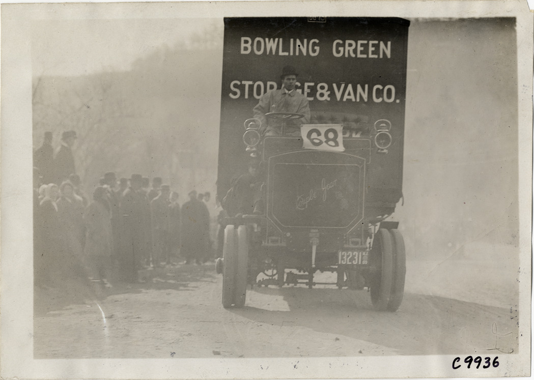 View of man driving Couple Gear truck no. 68 at 1909 Edgewater-Fort Lee Hill Climb in Fort Lee, New Jersey. Spectators watch from roadside. "Bowling Green Storage & Van Co." painted on truck. Stamped on back: "Spooner & Wells, Inc., photographers, telephones 3472-3473 Columbus, 1931 Broadway, New York." Handwritten on back: "Hill Climbs--Edgewater-Fort Lee Hill Climb, 1909."
