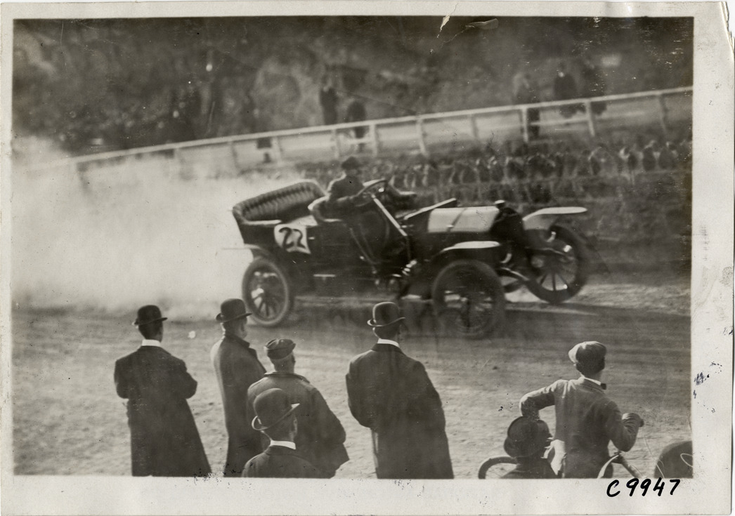 View of driver in car no. 22 at 1909 Edgewater-Fort Lee Hill Climb in Fort Lee, New Jersey. Spectators watch from roadside. Stamped on back: "Spooner & Wells, Inc., photographers, telephones 3472-3473 Columbus, 1931 Broadway, New York." Handwritten on back: "Hill Climbs--Edgewater-Fort Lee Hill Climb, 1909."