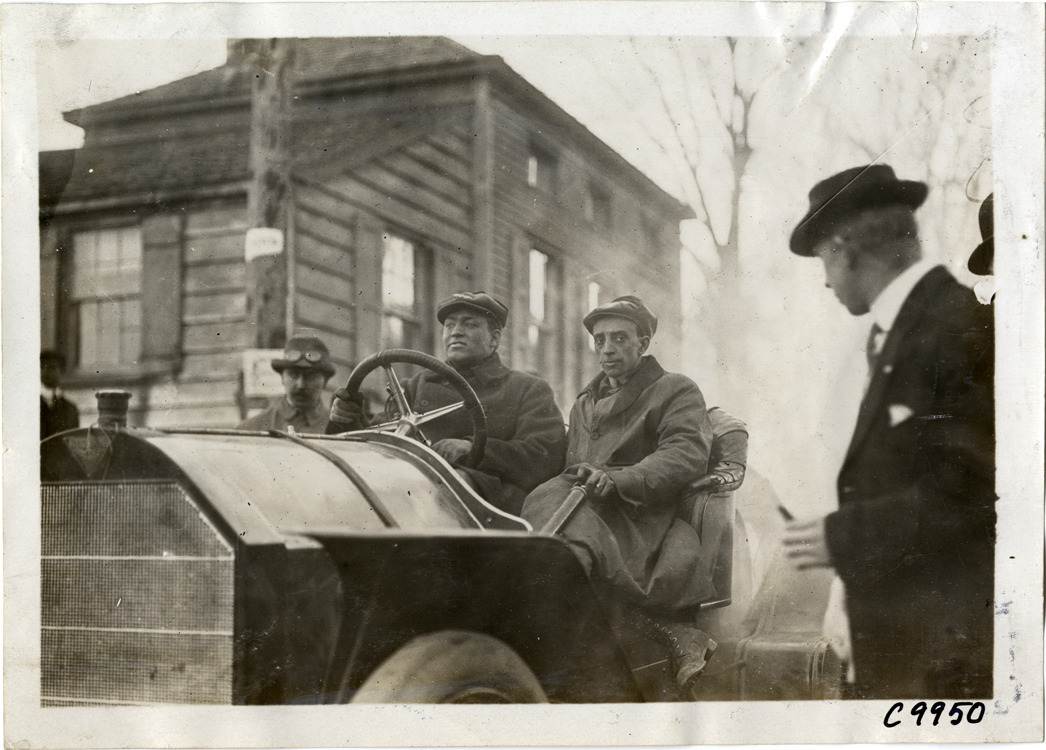 Driver and passenger in racecar, 1909 Edgewater-Fort Lee Hill Climb