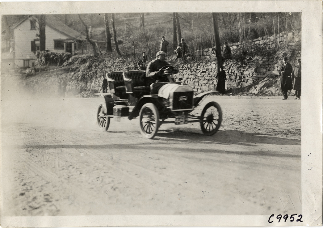 View of driver in Ford racecar at 1909 Edgewater-Fort Lee Hill Climb in Fort Lee, New Jersey. Spectators watch from roadside; wooden-frame house in background. Stamped on back: "Spooner & Wells, Inc., photographers, telephones 3472-3473 Columbus, 1931 Broadway, New York." Handwritten on back: "Hill Climbs--Edgewater-Fort Lee Hill Climb, 1909."