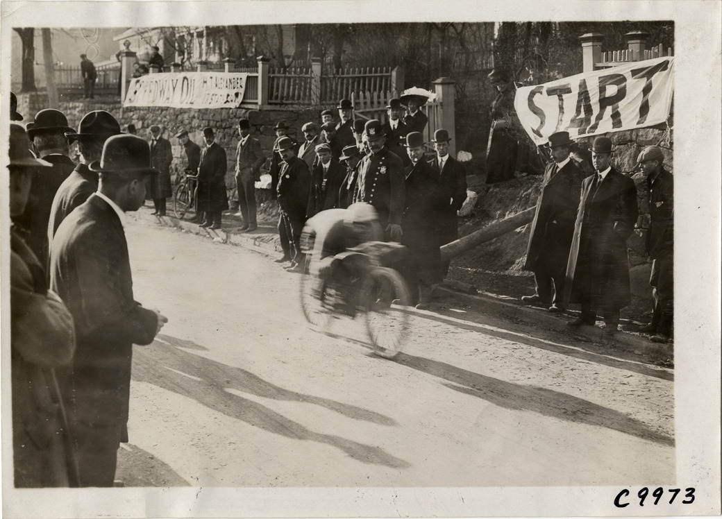 View of man racing motorcycle at 1909 Edgewater-Fort Lee Hill Climb in Fort Lee, New Jersey. Spectators watch from roadside; Speedway oil banner in background. Stamped on back: "Spooner & Wells, Inc., photographers, telephones 3472-3473 Columbus, 1931 Broadway, New York." Handwritten on back: "Hill Climbs--Edgewater-Fort Lee Hill Climb, 1909."