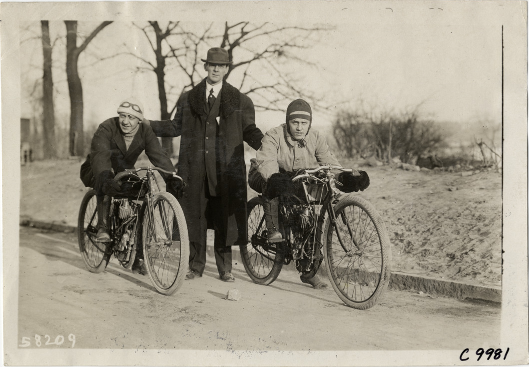 Man posing with two motorcyclists, 1909 Edgewater-Fort Lee Hill Climb