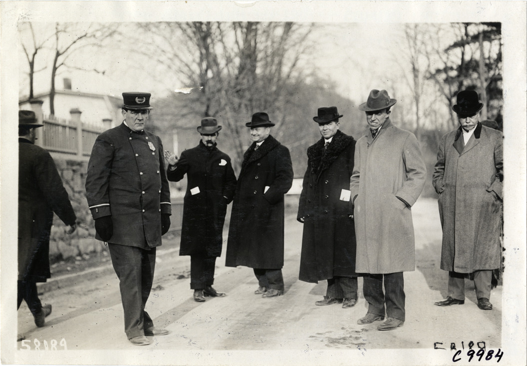 View of several men and policeman at 1909 Edgewater-Fort Lee Hill Climb in Fort Lee, New Jersey. Stamped on back: "Spooner & Wells, Inc., photographers, telephones 3472-3473 Columbus, 1931 Broadway, New York." Handwritten on back: "Hill Climbs--Edgewater-Fort Lee Hill Climb, 1909."