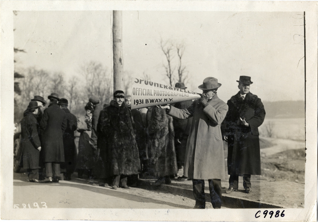 View of man holding megaphone at 1909 Edgewater-Fort Lee Hill Climb in Fort Lee, New Jersey. Spectators stand nearby; megaphone is printed with "Spooner & Wells, official photographers, 1931 B'way, N.Y." Man wearing fur coat stands in front of utility pole. Stamped on back: "Spooner & Wells, Inc., photographers, telephones 3472-3473 Columbus, 1931 Broadway, New York." Handwritten on back: "Hill Climbs--Edgewater-Fort Lee Hill Climb, 1909."