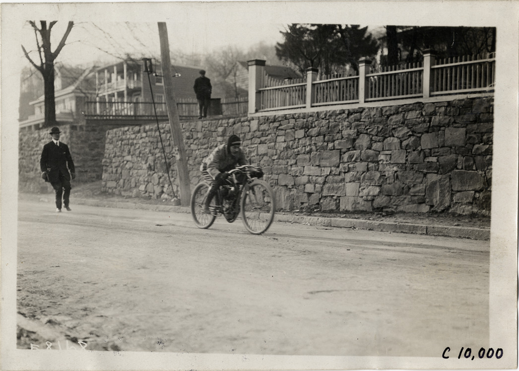 View of man racing motorcycle at 1909 Edgewater-Fort Lee Hill Climb in Fort Lee, New Jersey. Stone wall, fence and two men in background. Stamped on back: "Spooner & Wells, Inc., photographers, telephones 3472-3473 Columbus, 1931 Broadway, New York." Handwritten on back: "Hill Climbs--Edgewater-Fort Lee Hill Climb, 1909."