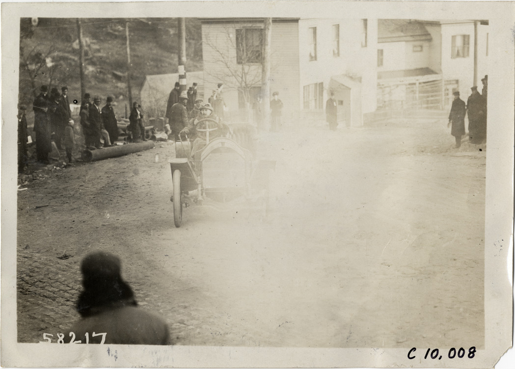 View of driver in racecar at 1909 Edgewater-Fort Lee Hill Climb in Fort Lee, New Jersey. Spectators watch from roadside; buildings in background. Stamped on back: "Spooner & Wells, Inc., photographers, telephones 3472-3473 Columbus, 1931 Broadway, New York." Handwritten on back: "Hill Climbs--Edgewater-Fort Lee Hill Climb, 1909."